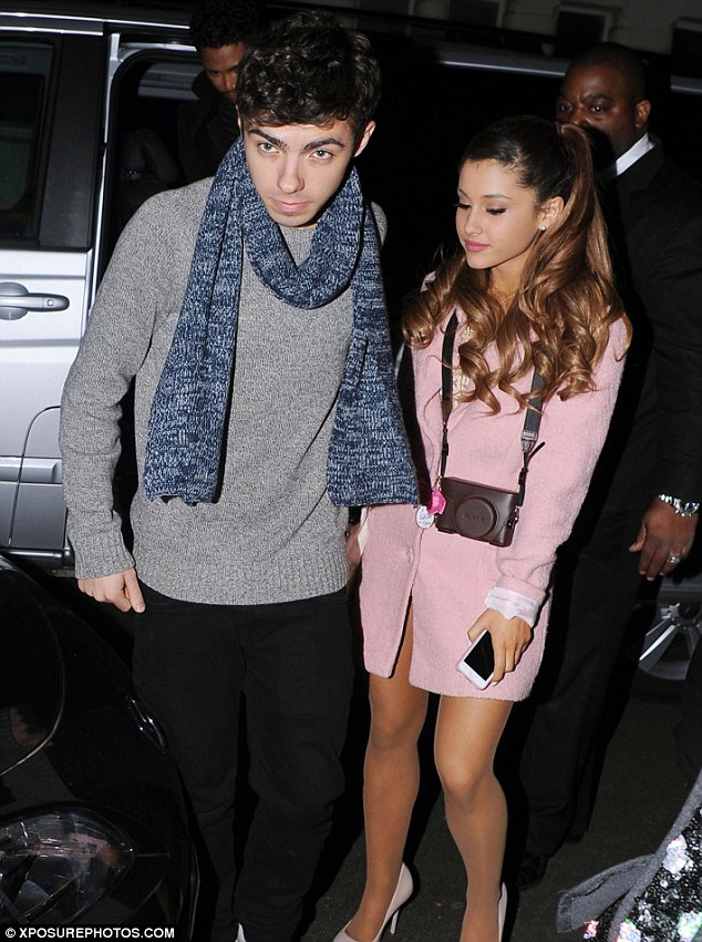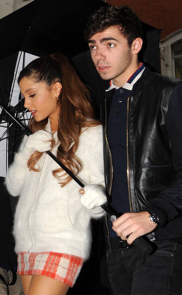 영국 보이밴드인 The Wanted의 네이선 사이크스와 교제했다. 같이 디즈니에서 데이트하는 사진도 올라오고, 함께 작업한 노래 Almost Is Never Enough가 매우 좋은 평을 얻는 등 깨가 쏟아지는 커플이었다. 두 사람이 매우 잘 어울린다면서 The Wanted의 팬들과 아리아나의 팬들 모두 지지하는 커플이었다. 그런데 아리아나와 자이가 다시 뮤비를 찍은 것으로 연기인 것은 알지만 둘이 바람이 났었다고 말하면서 싸움이 있었고 그 이후로 둘은 헤어지게 되었다. 그리고 2년 이 지난 후에 “Over And Over Again” 라는 콜라보를 발매했다.